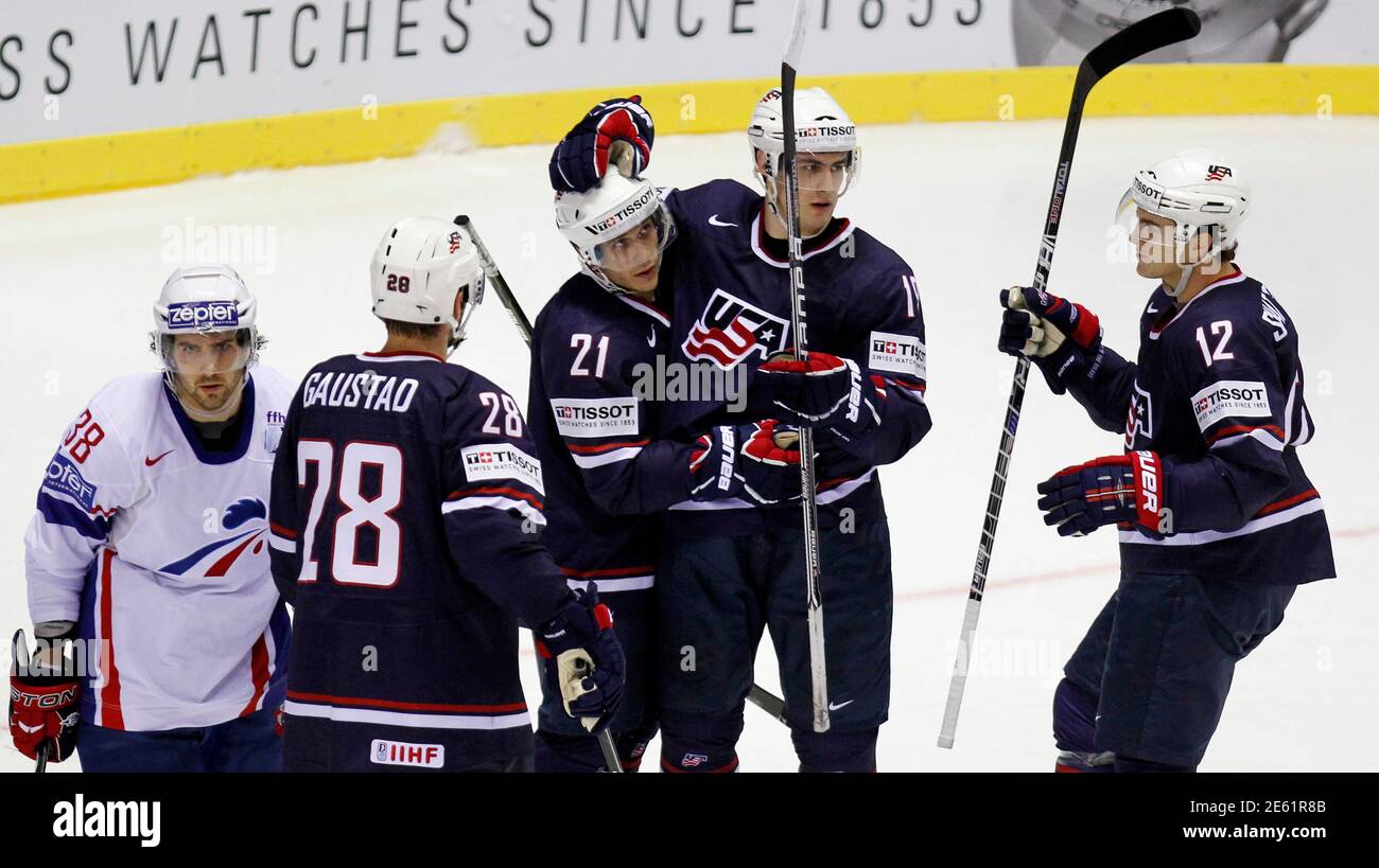 Spieler Des Team Usa V L Paul Gaustad Andy Miele Chris Kreider Und Kevin Shattenkirk Feiern Ein Tor Gegen Frankreich In Der Qualifikationsrunde Gruppe F Spiel Bei Der Eishockey Wm In Kosice Slowakei 7